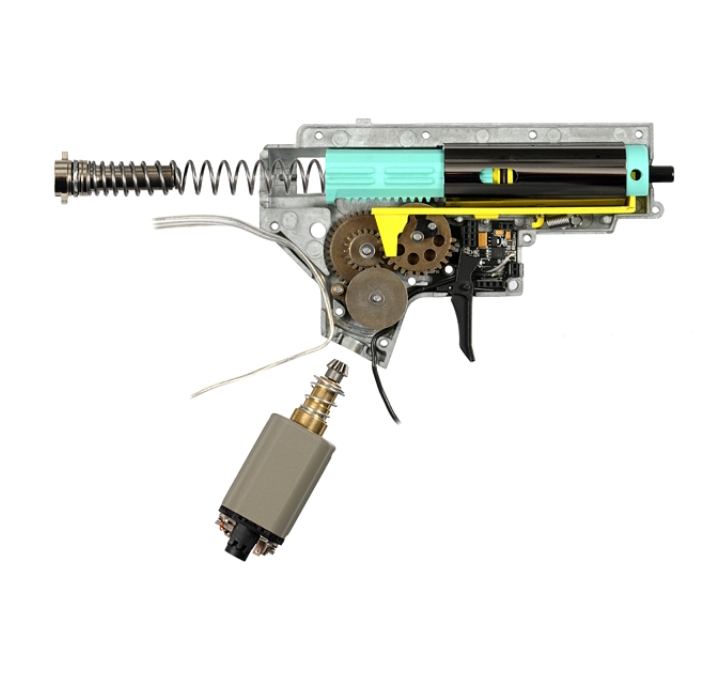 The Falcon electronic system is very nice and easy to program, the instruction for programming the is included with the other papers in the box. We can set the trigger sensitivity, we can set the burst up to 5 shots and, interestingly, we can set two shots.After a closer look at the gearbox , we can see that in some places it is not exactly made, the edges are not straight, the holes that are to improve the gearbox life are not even. As for me, this is not a disadvantage but it stings a bit in the eyes.The hop up chamber is standard rotary made of plastic and gives the impression of being solid.